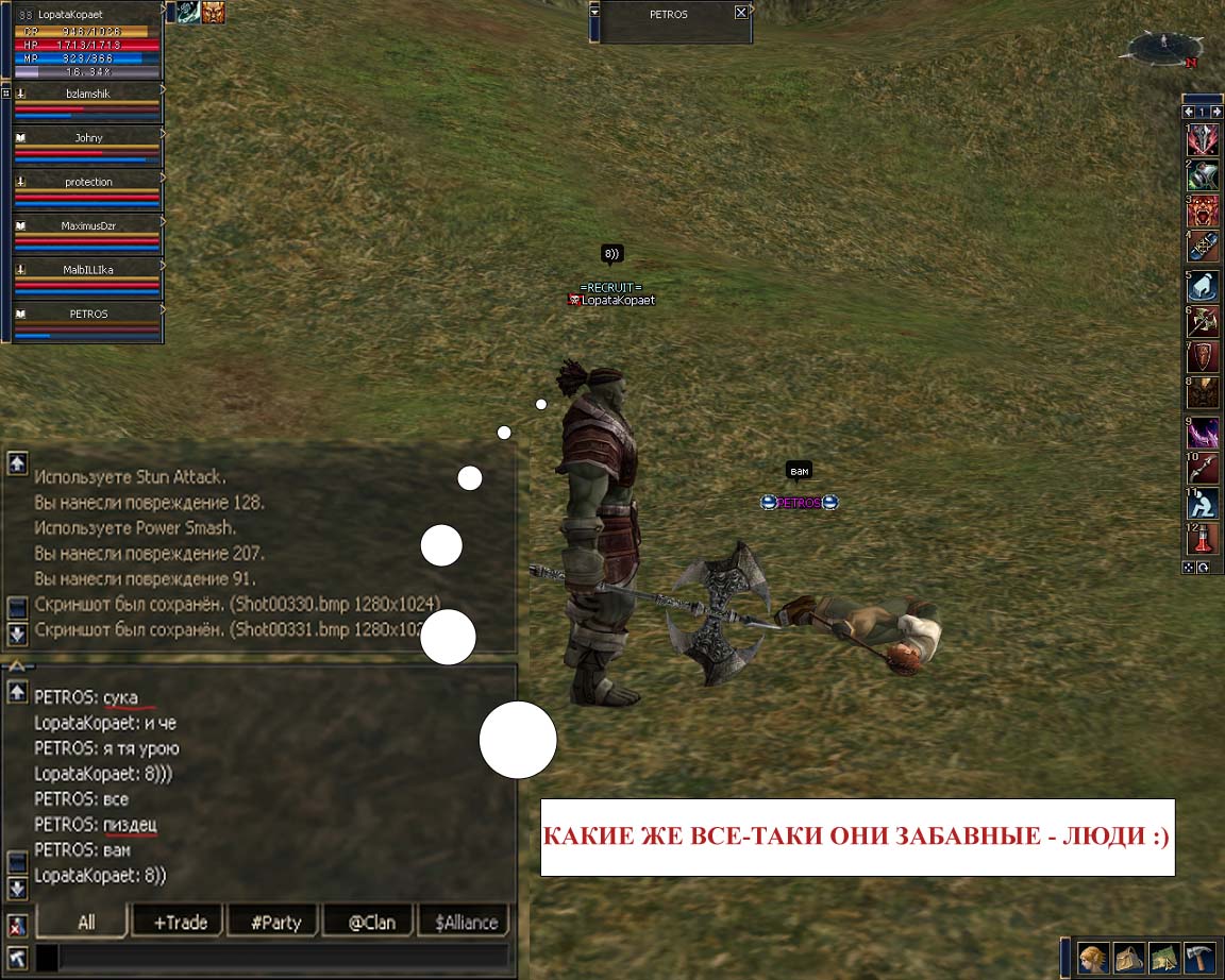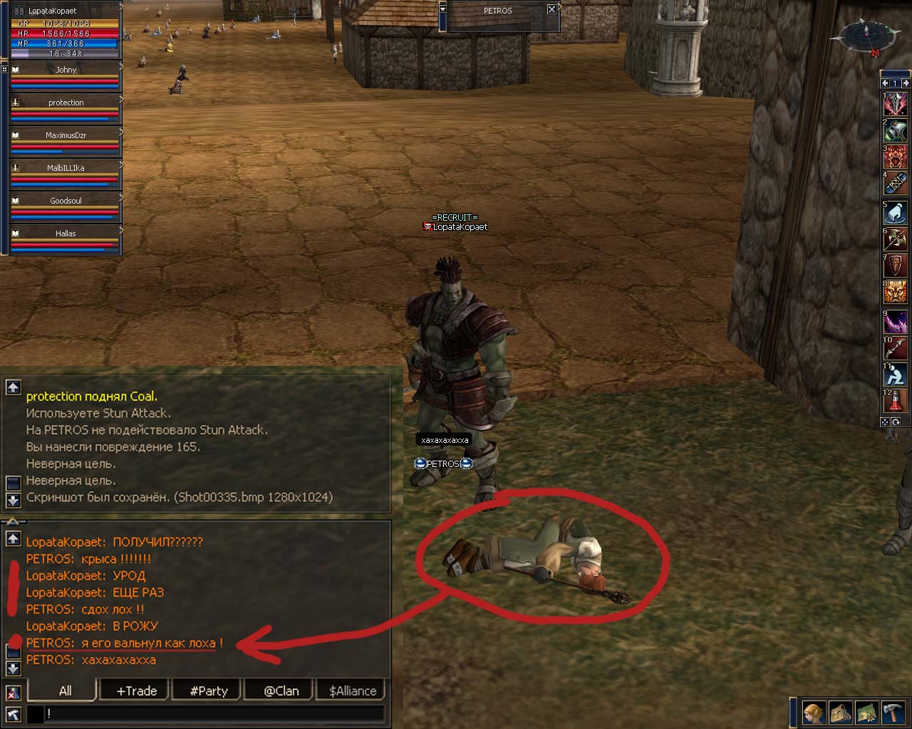 | Братья! Сегодня ночью 23 октября 2006 года я наткнулся на идиота!.....В общем после долгих пребывайний в катакомбах я решил может сходить на рейда? Морды мобов мне видеть надоело...и вот прихожу я в Тавн Оф Глудио 8) Решил собрать пати... покричал покричал собрал немного людей .....ну не тока людей там там разные гады были... слышу некий Идиот "Мне пати ! я хочу на Рейда" ну хочеш так хочеш.. на лови те пати...иду среди барыг смотрю соулшоты ..этот самый PETROS его звать говорит мне - "Пойдем под мост я те покажу кое что" ... я немного удивился..ну пойдем.... *(Так как играл ночью и качался в катах умалешенно немного сглупил и подумал *Он шо..рейда под мостом нашел???*.....спускаемся под мост и тут до меня доходит КАКОЙ НАХРЕН РЕЙД ПОД МОСТОМ????? Бомж-рейд у костра???? - а этот очень храбрый парень сходу заевляет *Все PI**EZ Те зеленая мразь......- я вообще в шоке был ...все в голове перепуталось он меня сходу начал бить какими то фаер болами дибильными но Лопата то это Лопата! Я ему с разбегу в лицо с сапога НАААА...он давай бежать фриз еще накинул на меня...бегал бегал потом ..... вдруг упал......оказалось это я его догнал 8)и начал плести какую то чуш про то что нам всем каюк у на снету шансов ....еще что то в этом роде... я ниче неотвечал поначалу тока улыбался.... Он мне заявляет .... "Я ЩА ОДЕНУ ШМОТ И ТЕ *CENSORED*" ну шмот так шмот валяй я жду....... Сразу же прибегает это чучело в каком то старом бабушкеном халате и опять же говорит " ТЕПЕРЬ ТЕБЕ ТОЧНО ПОЛНЫЙ *ЦЕНЗУРЕД*" ....Ну давай Великий Маг и Волшебник кодуй колдунство...... Он в меня опять швыряет каким то говном.... и начинает убегать....опять кошки мышки бегаем бегаем удар за ударом....и тут тока под конец я дурак додумался включить видео...блин ... дальше я его убиваю на мосту..как вы увидете.....но потом начинается сверх наглость!!!!!!!! скрин который я вылажу как разберусь уменьшать его)) ЭТОТ просто нет слов КАРТОННЫЙ ДУРЕНЬ ВИДИТ ЧТО ОН МЕНЯ НЕМОЖЕТ УБИТЬ НАЧИНАЕТ ОРАТЬ ЧТО Я КРЫСА!!!!ЧТО Я СПЕР У НЕГО КАКИЕ ТО БОТИНКИ!!!!ТУНИКУ ПОСОХ МАШИНУ КЛЮЧИ ОТ ДОМА ПРАВА ТЕХОСМОТР БАБУШКУ И ВАЗИЛИН!!!! Я В ШОКЕ ПРОСТО!!!!!!!! Причем орет во всю глотку!!!!!Ну я тада немного разозлился начал кричать что то типа Мразь Чмо иди сюда )) но без мата.....ну просто обидно када тя крысой зовут!!!! хотя это не так!И я конечно ему еще раз разбиваю рыло! а так как он после каждой смерти бегал туда где я стою..(около моста) там небыло народу Он лежа орет ХААХХАХА Я его завалил как лоха! Про этот скрин я уже говорил см.выше^ ...вот ну тада я побежал сразу к пвп воротам и конечно же Эта глупость тоже пошла туда и я еще раз убил его прилюдно 8) Тада он опять начал кричать что я крыса....в общем я его убил 5 раз....меня уже из пати успокоили шоп я его больше не бил потмоу что я пати делал я на рейда и веду) Ну и пошил мы на рейда....) Ходили Ходили Били Били и я приволок с собой Вар Хаммер Топ Д пушка 8) вот в общем какая история... P.S. НАХЕРА НАДО БЫЛО ИДТИ ПОД МОСТ???????????О,О Добавлено (2006-10-23, 11:02 Am) --------------------------------------------- Два скрина надо как то выложить ..блин неумею сжимать файлы ... Витя помогай))) У тебя они есть я тебе скидывал сам выложи У меня неоткрываются они почему то